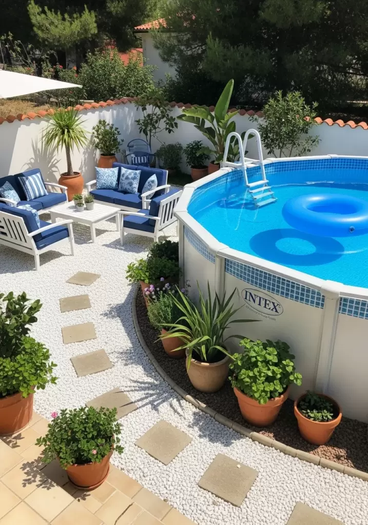Bring the breezy feel of the Mediterranean to your Intex pool. Decorate with white gravel, blue outdoor cushions, and terracotta pots filled with greenery for a coastal, relaxed vibe.