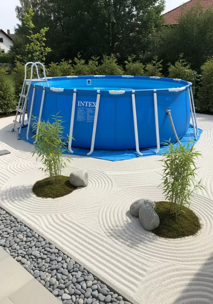 If you have a smaller Intex pool, create a calm, Japanese-inspired setting. Use sand, smooth stones, and simple greenery to build a peaceful zen garden around your pool.