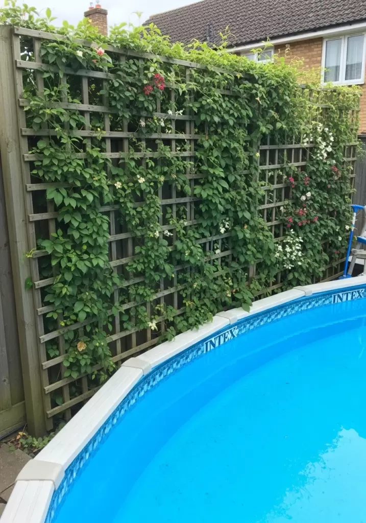 Want more privacy around your pool? Install a wood or metal trellis wall and let climbing plants grow on it. This not only creates a private space but also adds a beautiful green backdrop.