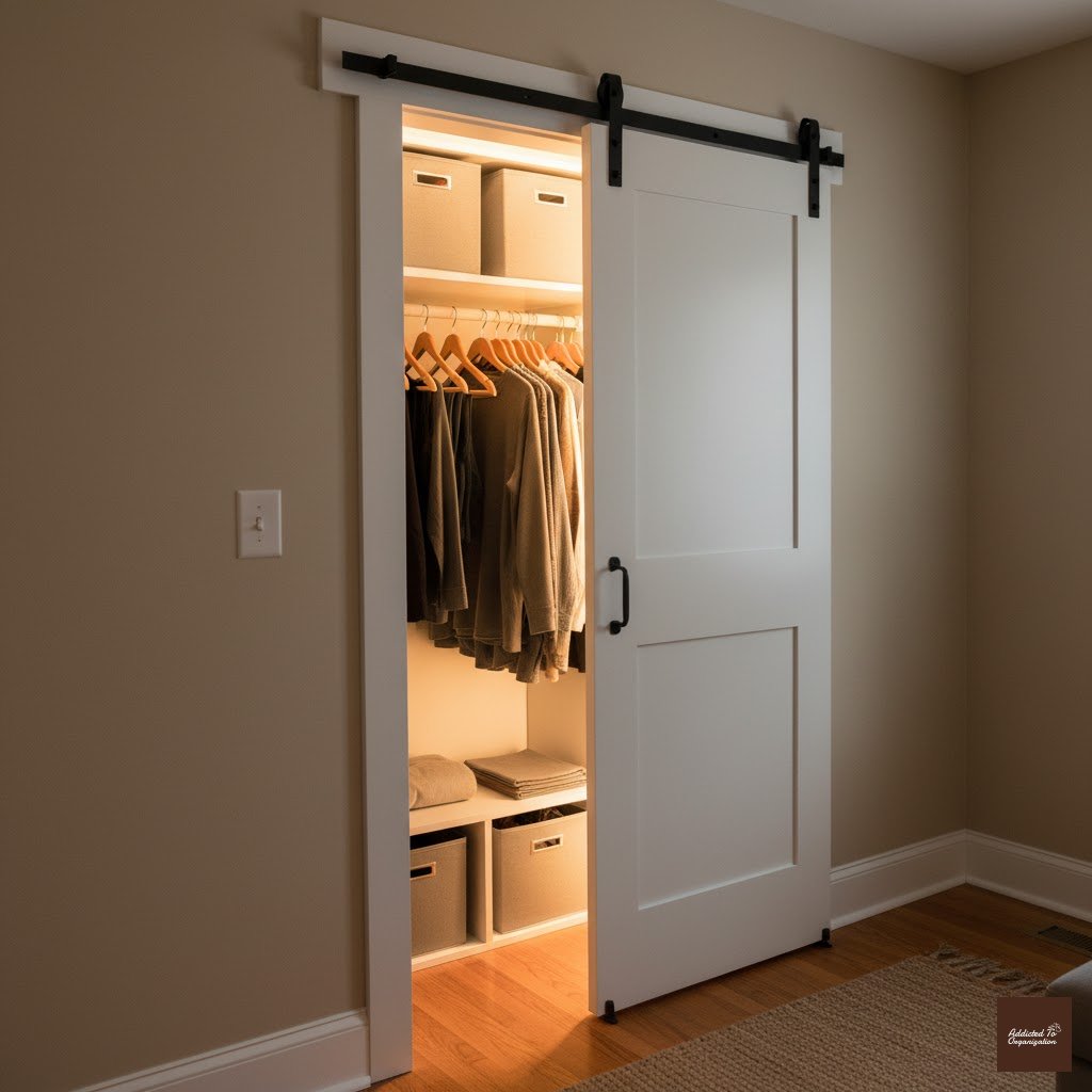 If your narrow closet opens into a tight bedroom space, switch the entry door to a pocket or sliding door. This eliminates the swing space required for a traditional hinged door, instantly freeing up precious floor area outside the closet.
