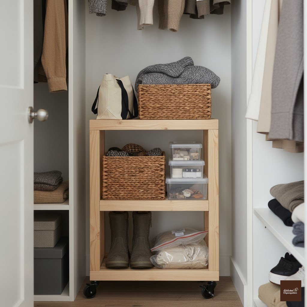 A slim rolling storage cart offers flexible organization that can be moved wherever you need it. It can hold seasonal accessories, extra toiletries, or folded clothes and can be tucked neatly into a corner when not in use.