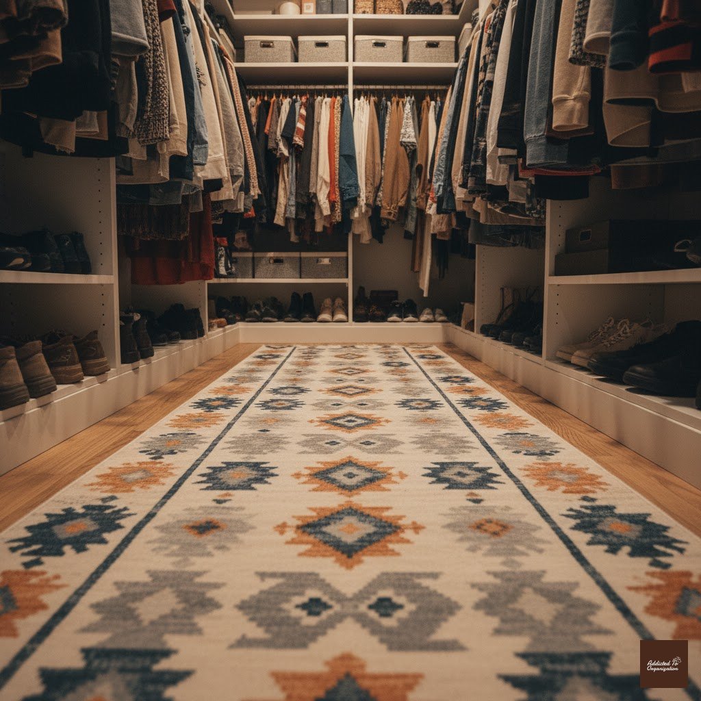 A narrow walk-in closet can feel sterile, but a fun, colorful runner rug instantly adds warmth, texture, and personality. It helps ground the space and makes the whole area feel more intentional and luxurious.