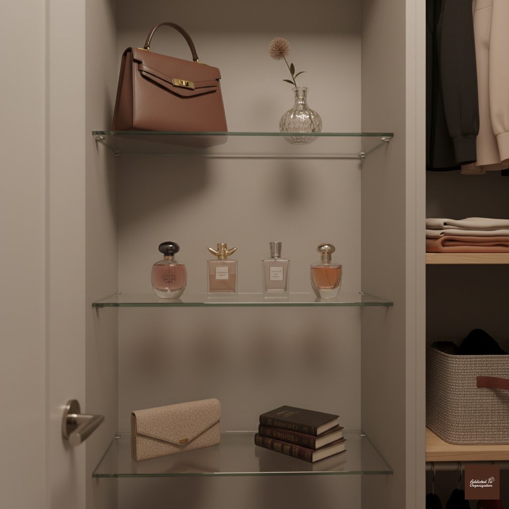 If you have designer bags, perfume bottles, or beautiful hats, display them on clear glass shelving. Glass shelves look light, modern, and open, and they allow light to filter through, making the entire display feel high-end and airy.