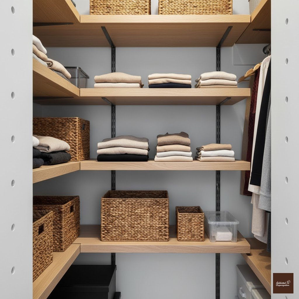 Life changes, and so do wardrobe needs. Opting for shelving units that can be easily adjusted vertically ensures you can customize the space based on changing needs, like needing more room for boots in winter or more space for folded shorts in summer.