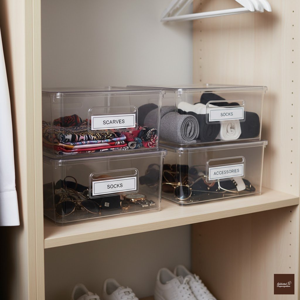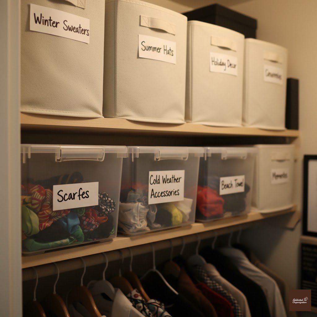 - Clearly label bins with contents and season (e.g., “Winter Sweaters”).