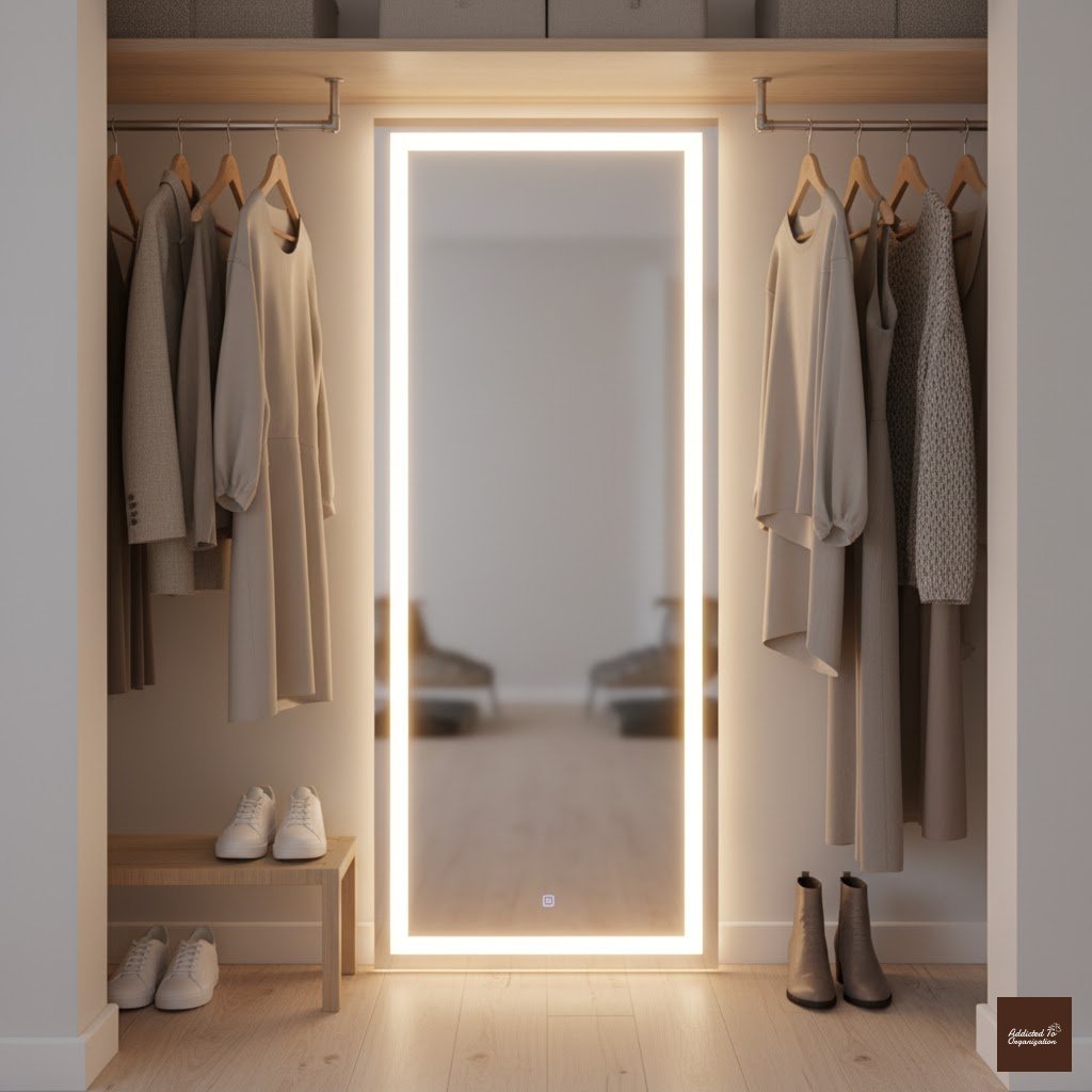 Installing a mirror panel with built-in or surrounding LED lights adds a chic, boutique feel. This makes trying on outfits more enjoyable and provides excellent, true-color illumination for getting ready—essential in a tight, dark space.