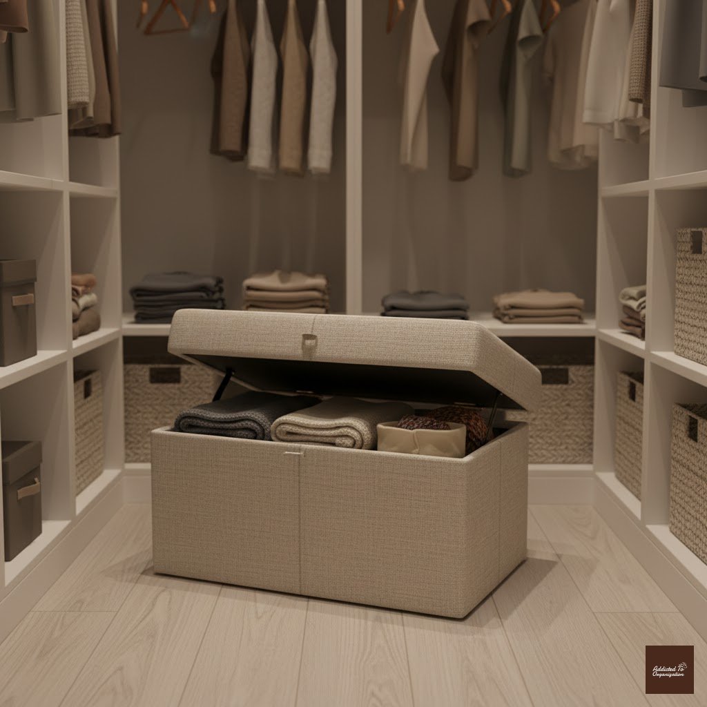 A small, multifunctional bench or ottoman is a fantastic addition. It provides a comfortable place to sit while putting on shoes and has interior space for extra storage like spare linens or rarely worn evening bags.