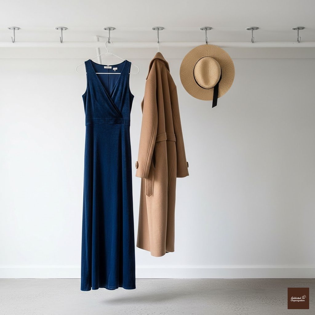 Don’t forget the ceiling! Heavy-duty ceiling hooks can be installed for hanging very long items like gowns, maxi dresses, or even tall boot storage bags. This keeps long pieces from dragging on the floor and utilizes otherwise dead space.