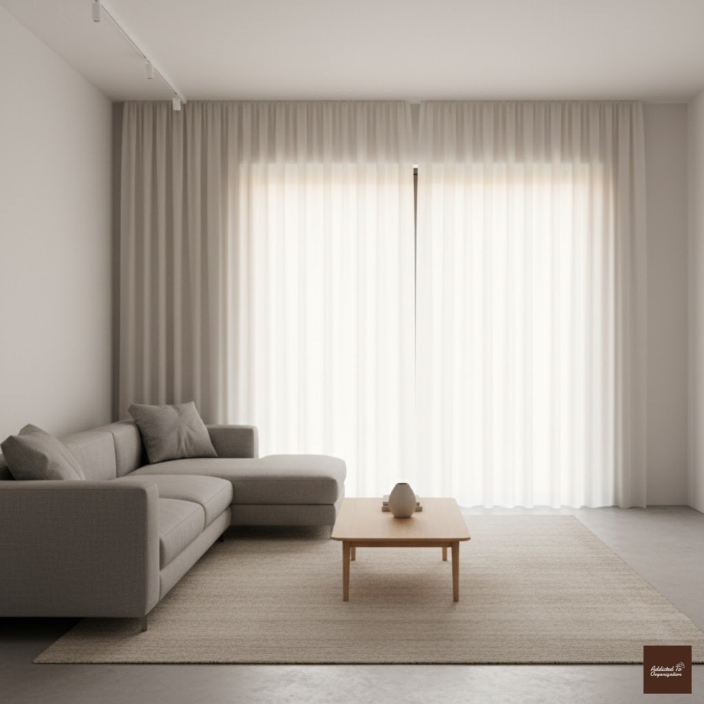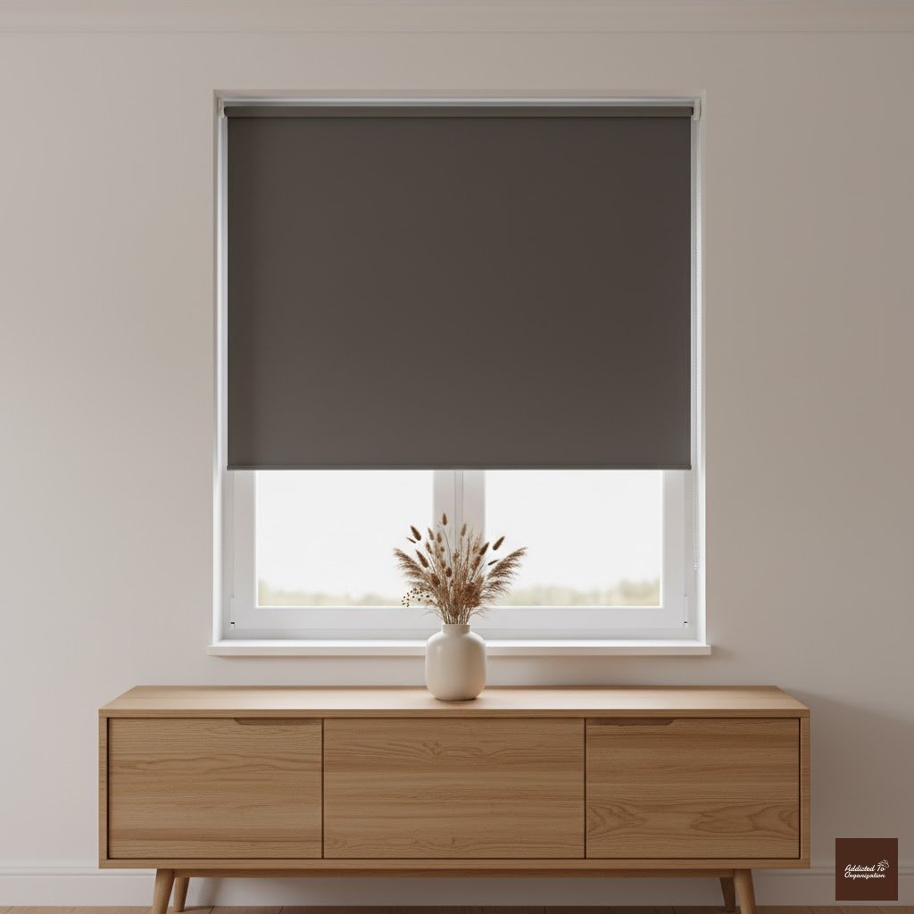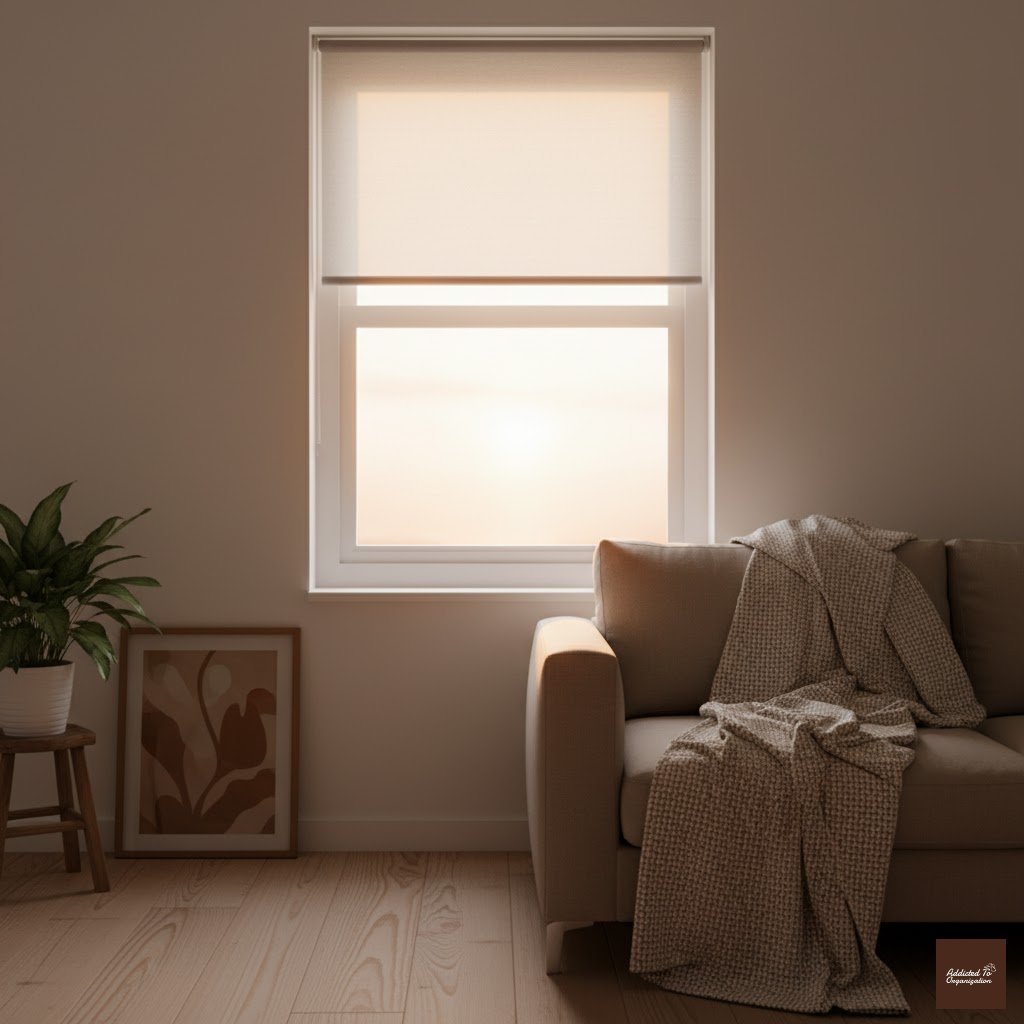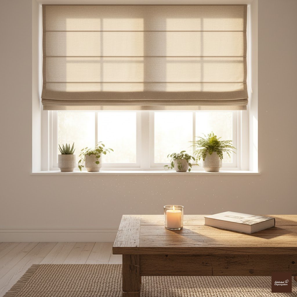 Simple, structured Roman shades blend seamlessly into minimalist or modern living rooms. Opt for soft beige, cream, or pale gray tones for versatility.