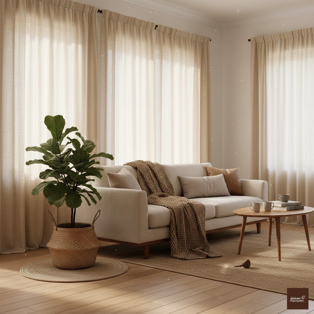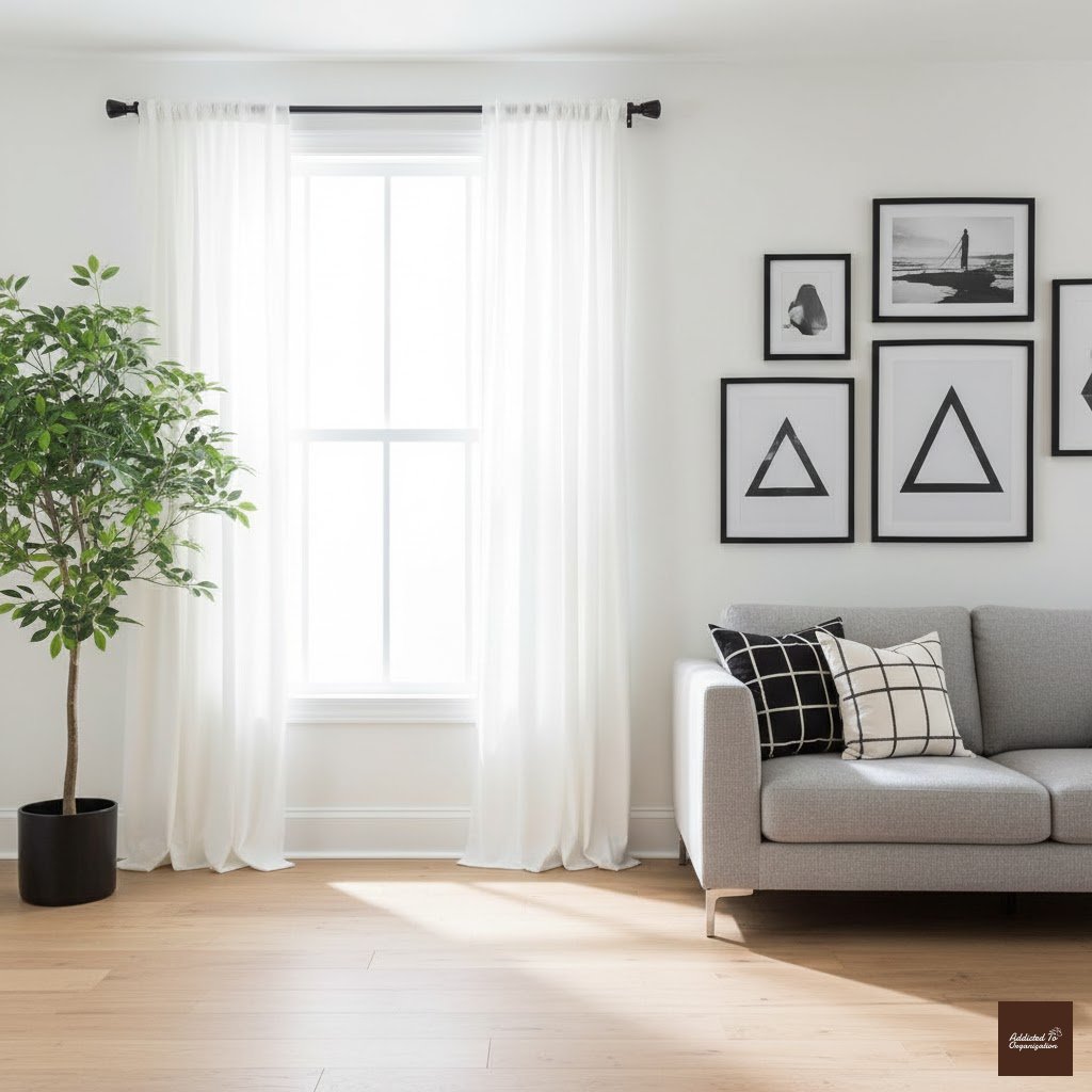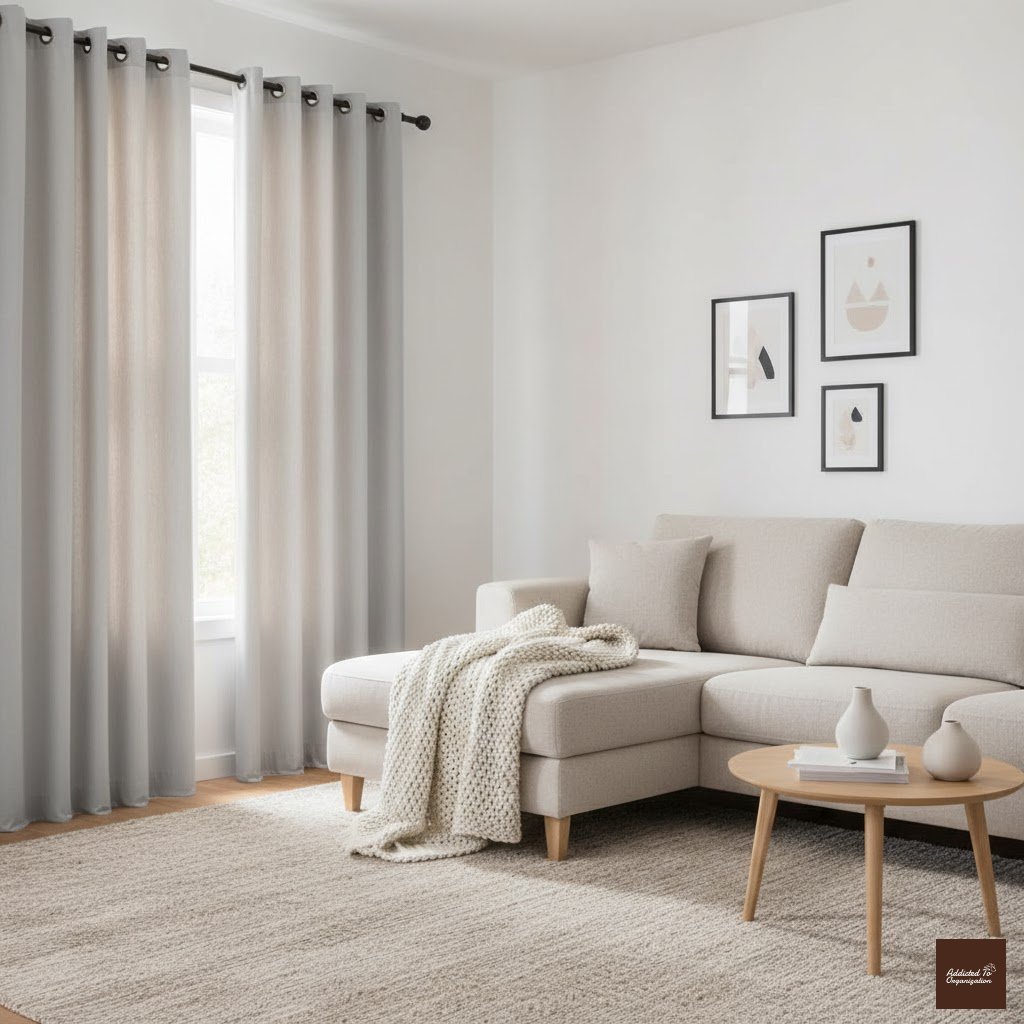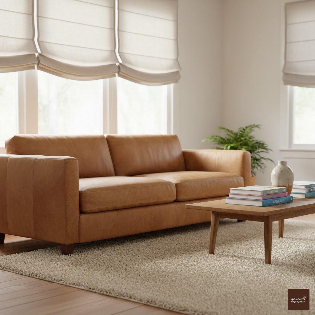 Simple, structured Roman shades blend seamlessly into minimalist or modern living rooms. Opt for soft beige, cream, or pale gray tones for versatility.