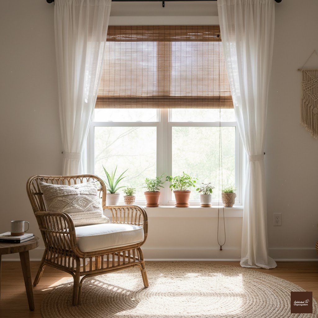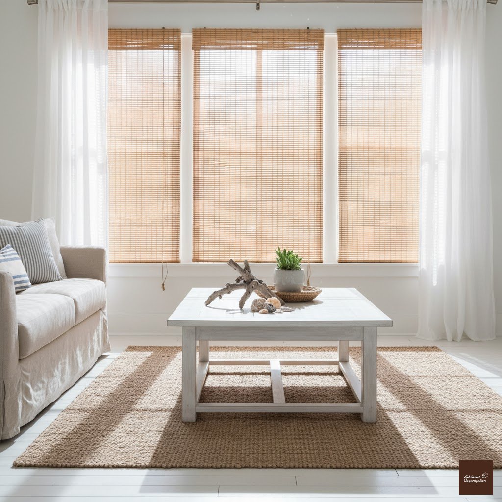 Eco-friendly and stylish, bamboo shades add a natural, earthy touch. Layer them with white curtains for a clean, coastal feel.