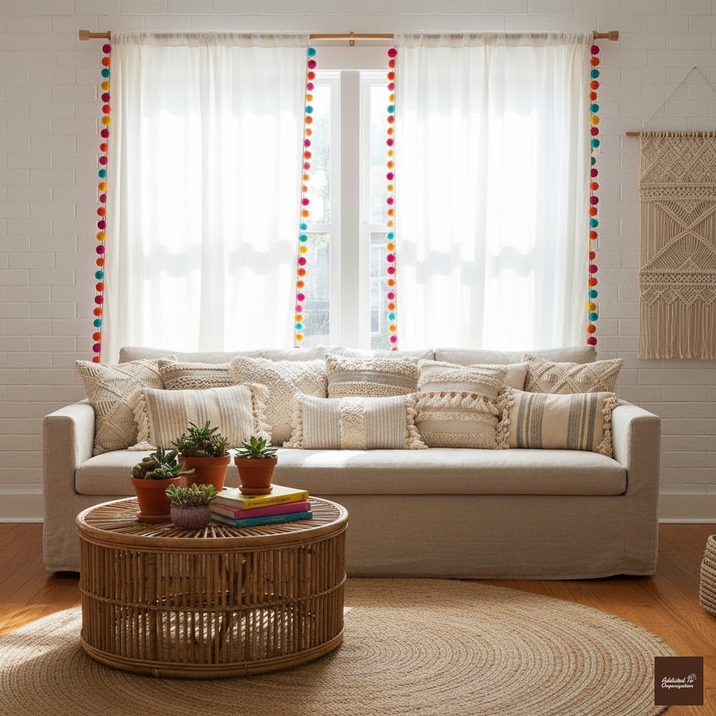 Pro Tip: DIY with budget panels—glue or sew pom-pom fringe along the inner edge for a custom look.
