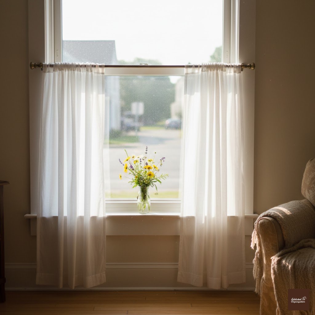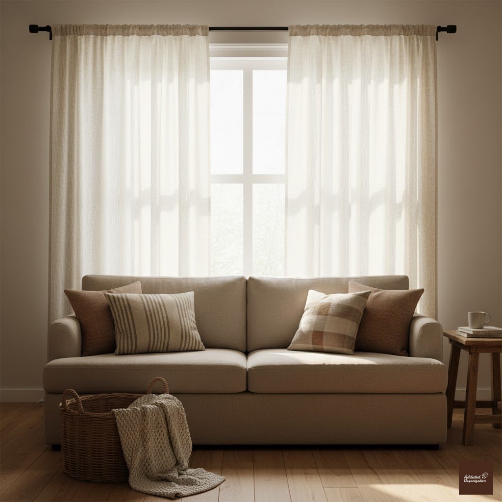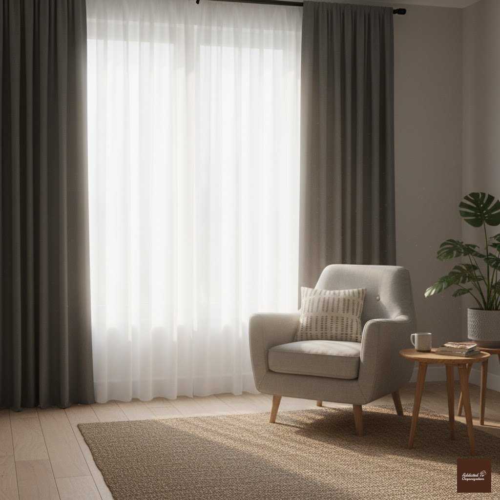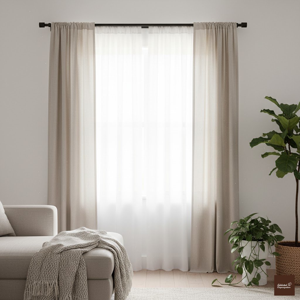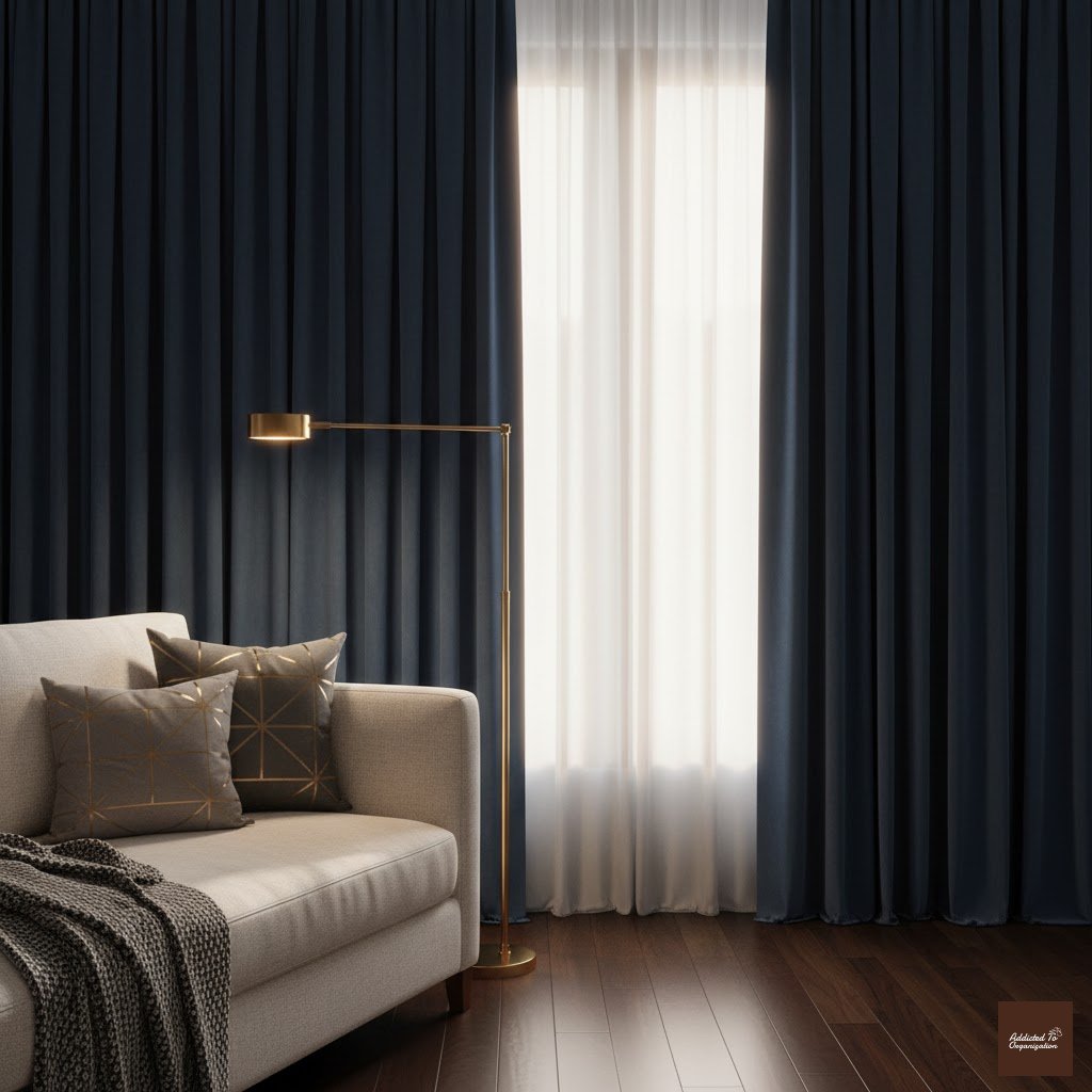 Pro Tip: Use a double curtain rod—place the sheer panels closer to the glass and the blackout panels outside.